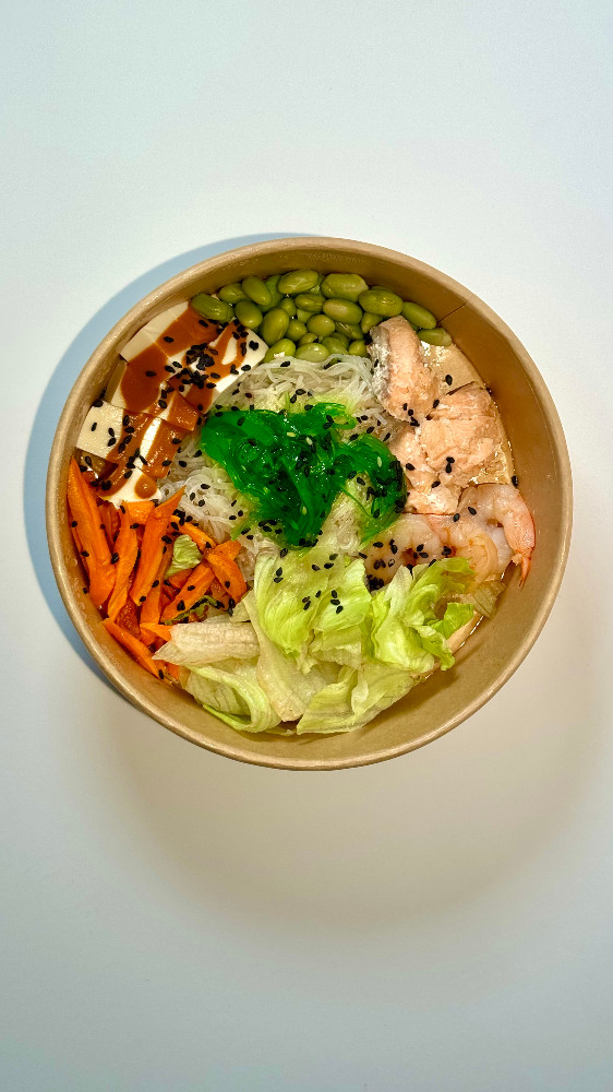 Склад: птітім неро (вода питна фільтрована, птітім, олія соняшникова рафінована, сіль, чорнила каракатиці), лосось запечений (філе лосося, сіль, олія соняшникова рафінована), сніжний краб,боби едамаме, помідори чері, морква печена (морква, олія соняшникова рафінована, сіль), огірок свіжий, креветка маринована (креветки, соус шрірача, сіль).