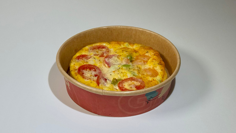 Склад: яйця курячі, борошно пшеничне вищого ґатунку, цукор білий кристалічний, йогурт кисломочний, масло вершкове, сир моццарелла, сир крем-каліфорнія, шинка свинна копчена, вода джерельна, томати свіжі, гірчиця в зернах, сода, розпушувач, сіль кухонна, камідь геланова Е418.