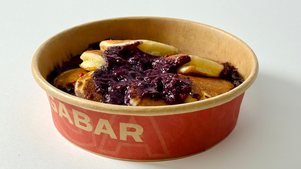 Склад: сир кисломолочний 9%, яйця перепелині, борошно пшеничне вищого ґатунку, цукор, борошно кукурудзяне, олія соняшникова рафінована, цукор ванільний, сіль), крем «кустард» з маскарпоне, молоко 2,5%, сир маскарпоне, суміш крем заварний, вода питна фільтрована), манго, чорниця.