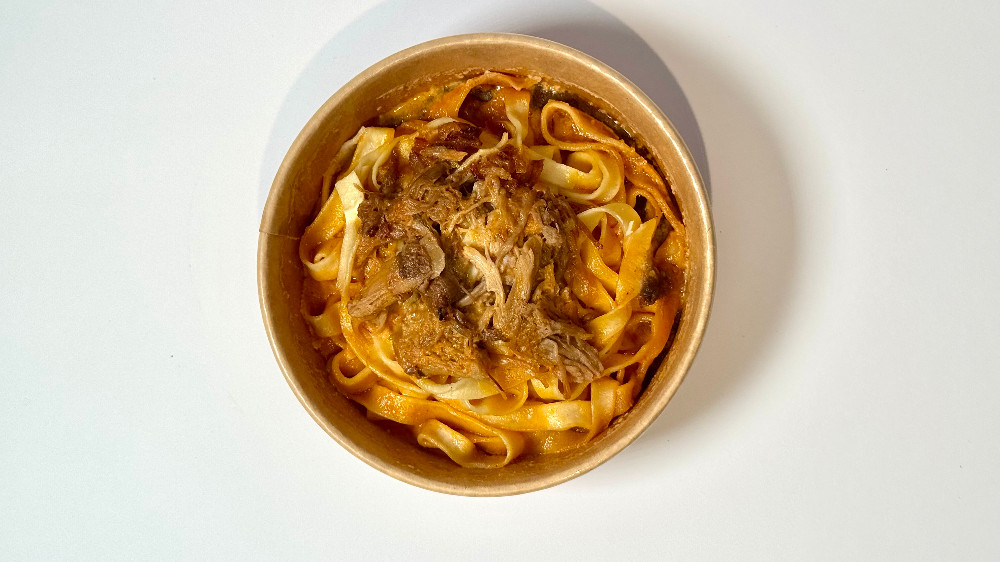 Склад: Паста відварена (борошно пшеничне вищого ґатунку, яйця курячі, вода питна фільтрована, олія соняшниковарафінована, сіль), соус (вершки кулінарні 30%, сир пармезан, сир Дорблю, сіль, паприка мелена, часниксухий), сіль, паприка копчена, часник сухий), рвана свинина (свиняча лопатка знежилована, цибуля ріпчаста, соус «Мехікано» сіль, цукор, часник сухий, паприка копчена).
