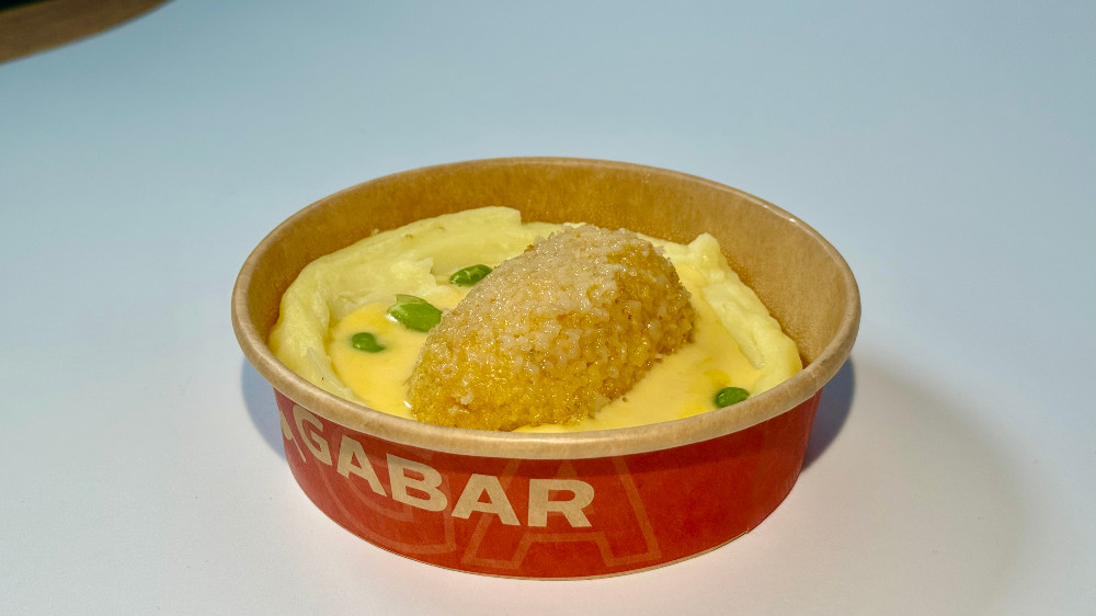 Склад: картопляне пюре (картопля, масло вершкове 72%, молоко коровʼяче 2,5%, сіль), київська котлетка (куряче філе, яйця курячі, батон, сухарі панко, сир моцарела, борошно пшеничне вищого ґатунку, крем-сир вершковий, олія соняшникова, сіль кухонна, перець чорний мелений), соус (вершки кулінарні 30%, сир чеддер, картопля, вода питна фільтрована, сир пармезан,сіль), боби едамаме.